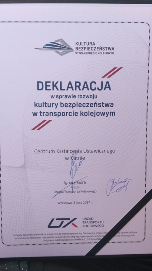 W dniu 3 lipca 2017 roku Centrum Kształcenia Ustawicznego w Kutnie dołączyło do szacownego grona Sygnatariuszy Deklaracji w sprawie rozwoju kultury bezpieczeństwa w transporcie kolejowym. Dokument uczestnictwa w imieniu całej społeczności Centrum podpisała p. dyr. Joanna Paćkowska – Dudzik w siedzibie Urzędu Transportu Kolejowego w Warszawie.